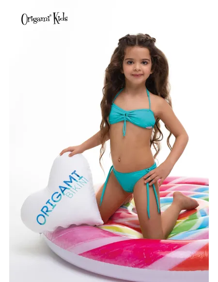 Origami Bikini dievčenská bandeau podprsenka → s nastaviteľným ramienkom okolo krku, nastaviteľným chrbtom a odnímateľnou tenkou vložkou. Jeho farba dokonale ladí s mnohými dospelými Origami bikinami.