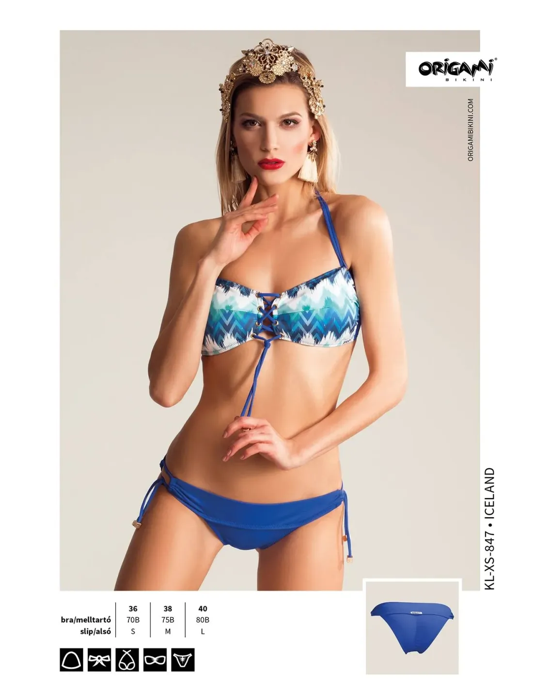 Origami Bikini Bandeau podprsenka → s tvarovanou košíkovou vložkou, bočnou výstužou, odnímateľným alebo zaväzovacím ramienkom okolo krku, vzadné viazanie.