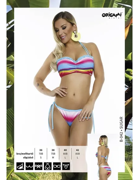 Origami Bikini Bandeau podprsenka → s košíkom v tvare push-up, bočnou výstužou, odnímateľným alebo zaväzovacím ramienkom okolo krku, zaväzovaním vzadu.