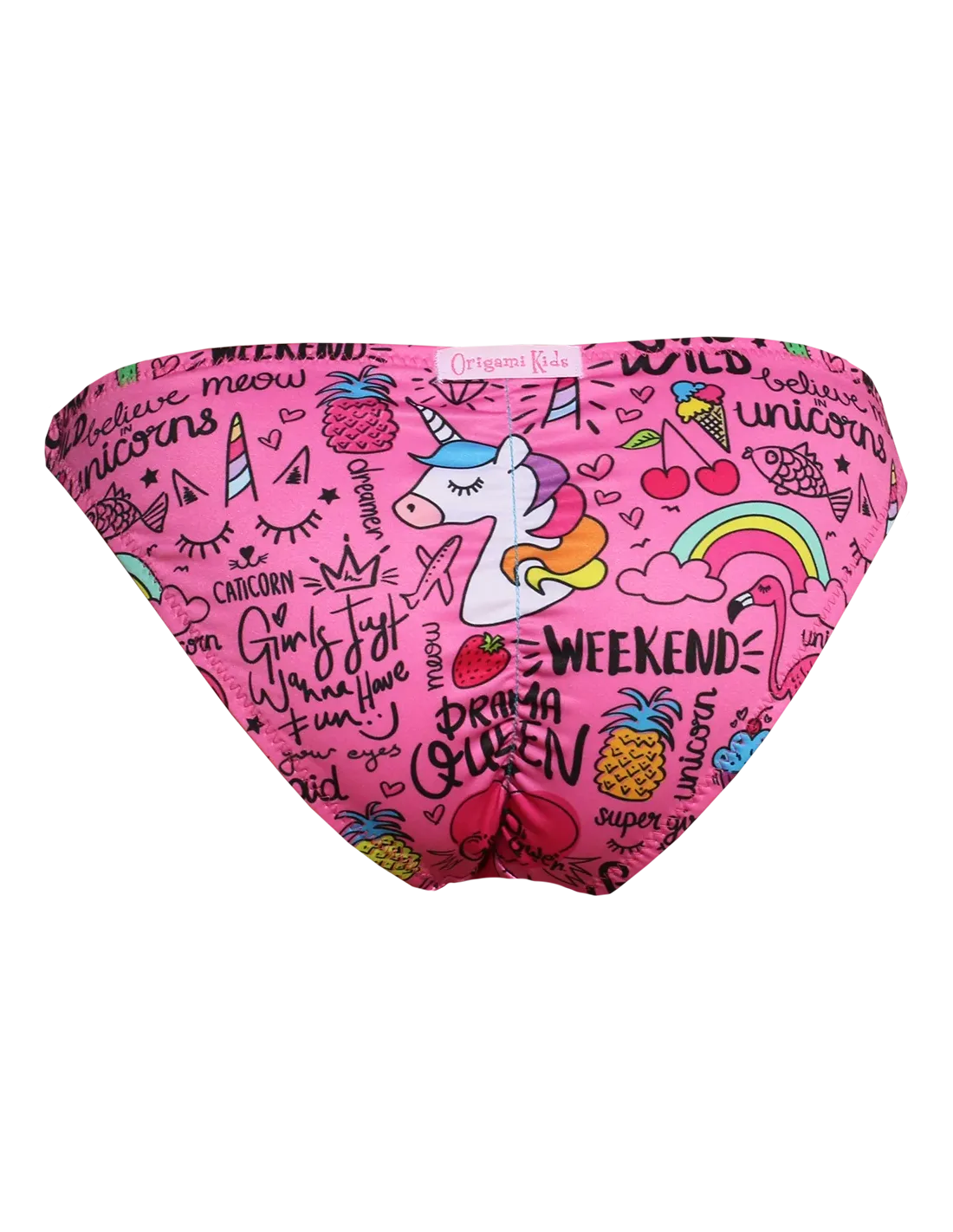 Spodok plaviek: Origami Bikini dievčenské normálne nohavičky → s nastaviteľným zaväzovaním na bokoch a pekným, polopokrčeným spodným dielom.