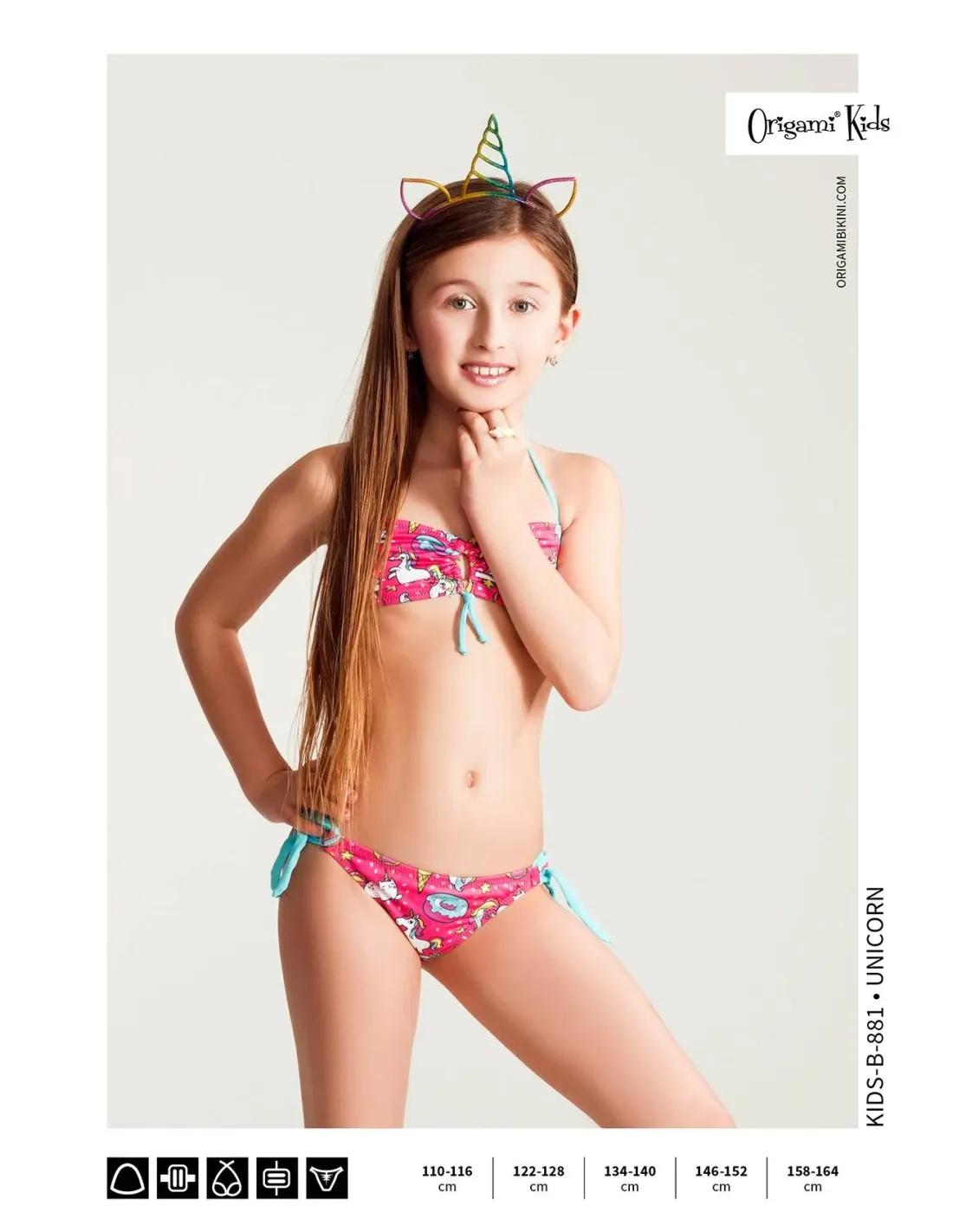 Spodok plaviek: Origami Bikini dievčenské normálne nohavičky → s nastaviteľným zaväzovaním na bokoch a pekným, polopokrčeným spodným dielom.