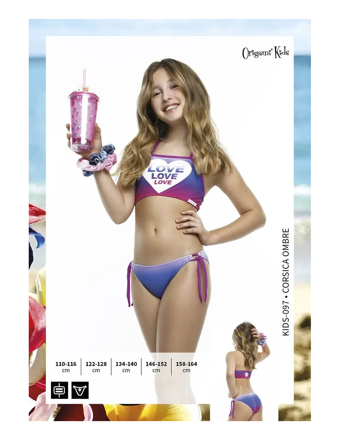 Spodok plaviek: Origami Bikini dievčenské normálne nohavičky → s nastaviteľným zaväzovaním na bokoch a pekným, polopokrčeným spodným dielom.